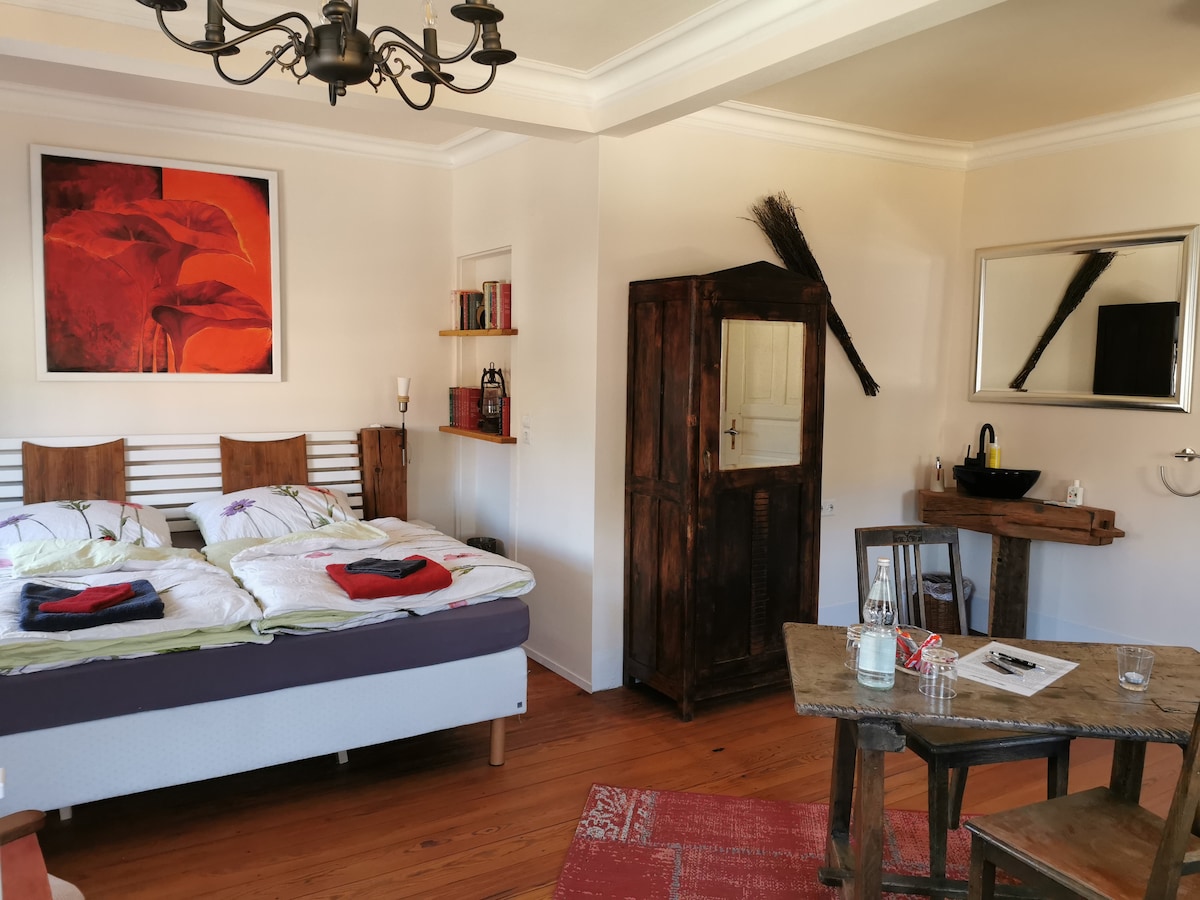 Large double room Kreuz with double bed (180x200) and a sofa bed (160x200). All rooms have their own bathroom, are non-smoking, pets are not allowed, heating/central heating, WiFi internet, no TV. Smoke detectors and carbon monoxide detectors are available. On request, you can book your breakfast with us in advance of your stay. Smoking is prohibited throughout the house. Two bakeries and other shopping facilities are within a few minutes' walking distance.