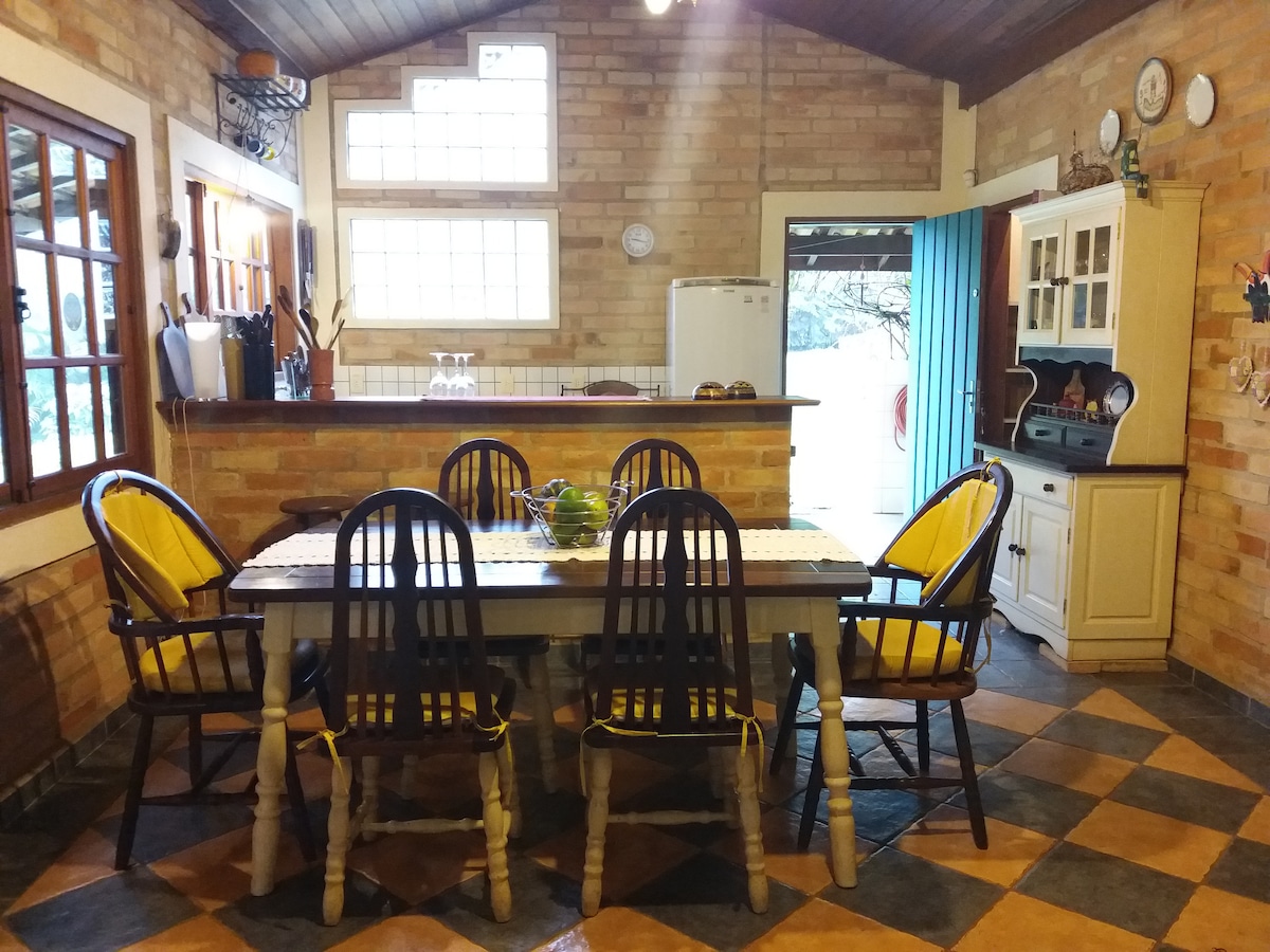 Casa de campo, com lazer completo para adultos e crianças a 50min de São Paulo - Capital. Casa espaçosa e confortável para até 15 pessoas, 6 suítes e varandas. Caso precise acomodar 17 pessoas NOS CONSULTE. Área gourmet espaçosa, confortável, com geladeira, cervejeira, churrasqueira e forno de pizza à lenha. Ideal para aproveitar com a família e amigos no verão curtindo a piscina ou no inverno aproveitando as lareiras.