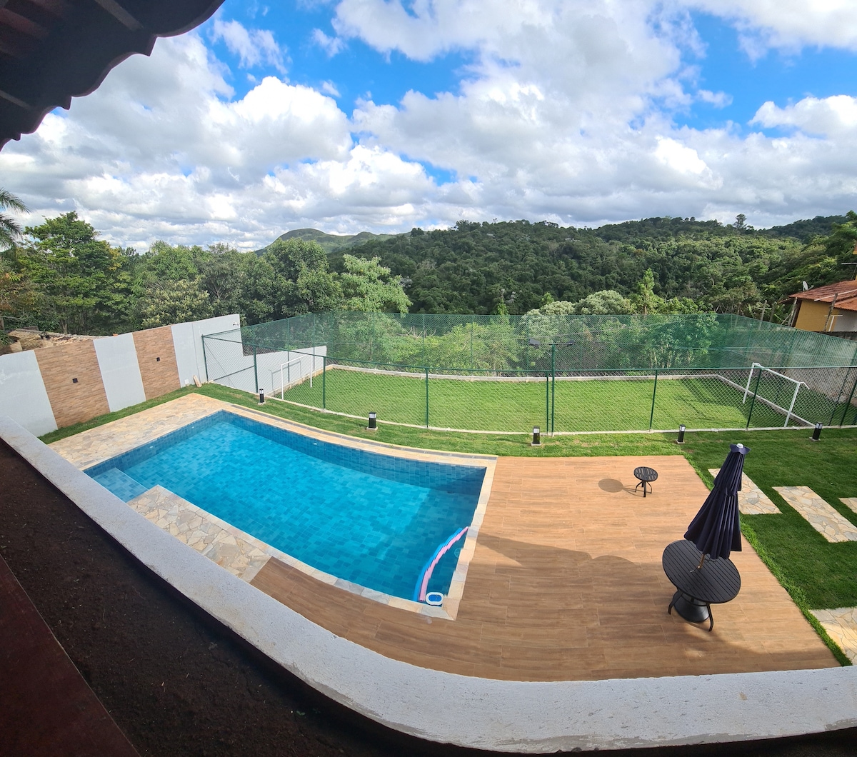 AGORA COM PISCINA AQUECIDA. ASSISTA A COPA EM UM SUPER TELÃO!! Imóvel novo recém inserido no catalogo do AirBnb Condomínio Porta do Sol COM ACESSIBILIDADE Relaxe com sua família nessa acomodação com piscina coberta, area de lazer, rua sem saida. São 4 suites, sendo duas com ar cond e duas com ventilador teto Uma suite com ACESSIBILIDADE. Roupa de cama completa. Salão com churrasq. forno pizza, bar,cozinha,adega,mesa jogos,telão. Redário, FirePlace, paz, sossego e segurança.