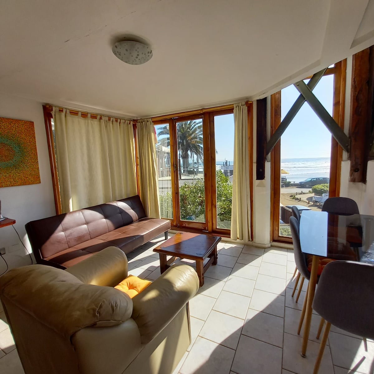 Lindísima, acogedora y amplia cabaña frente al mar en el mejor lugar de Maitencillo (2 horas de Santiago) muy bien equipada, se pueden hospedar hasta 9 personas cómodamente, condominio con piscina, quincho y estacionamiento privado. Terraza con vista al mar, living en terraza y playa en frente sin tener que cruzar una calle! Para disfrutar del mejor atardecer o pisco sour mirando a los niños sin que nadie interrumpa!! Condominio familiar se prohíben las fiestas!! Solo se arrienda por Airbnb.