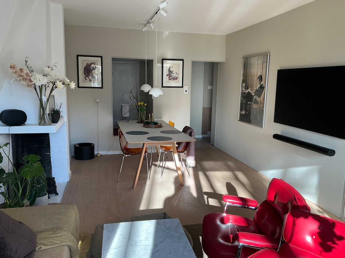 Beautiful and charming 80m² loft apartment. West-facing balcony overlooking a quiet courtyard. Modern fireplace. Centrally located, yet tucked away from traffic. Fully equipped kitchen. Short walk to bus, metro, and tram. A wide variety of shopping and dining options just steps away. Travel bed for kids and bed side Crip is available upon request