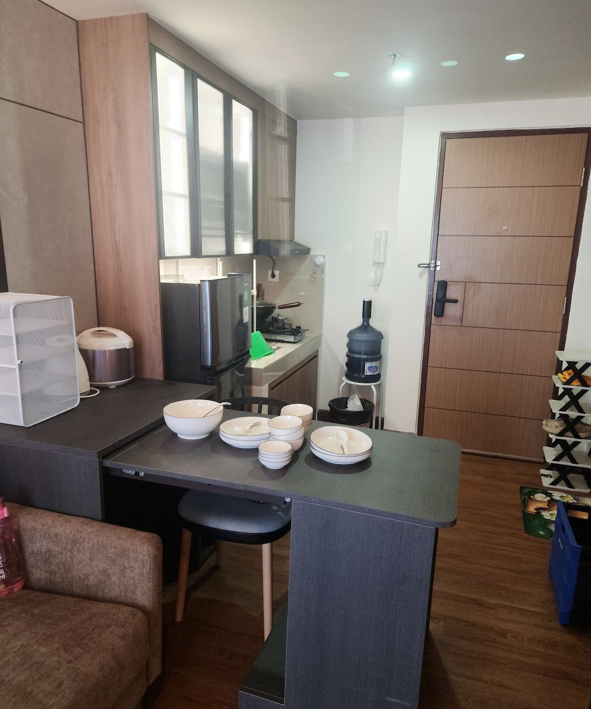 Suites tipo 2 dormitorios Tamaño : 80 m² -Fridge - Cafetera - Dispensador de agua. - Lavarropas. - Utensilios de cocina - Utensilios para limpiar - Wifi. - Calentador de agua. -Balconies - Televisión - Plancha de ropa - Línea de ropa plegable -prei/funda de cama -Electricity 3850 Watts Prestaciones 1. Piscina 2. Gimnasio 3. Seguridad las 24 horas 4. Acceso a la tarjeta 5. Electricidad y agua 7. Sala de eventos múltiple 8. Altitud del piso 31 en la azotea * Tarifa promocional de septiembre a octubre * Diariamente Rp1.5jt/malam Monthly Rp25.jt/bulan 1 año IDR 200m * La tarifa de mantenimiento es a cargo del propietario de la unidad *