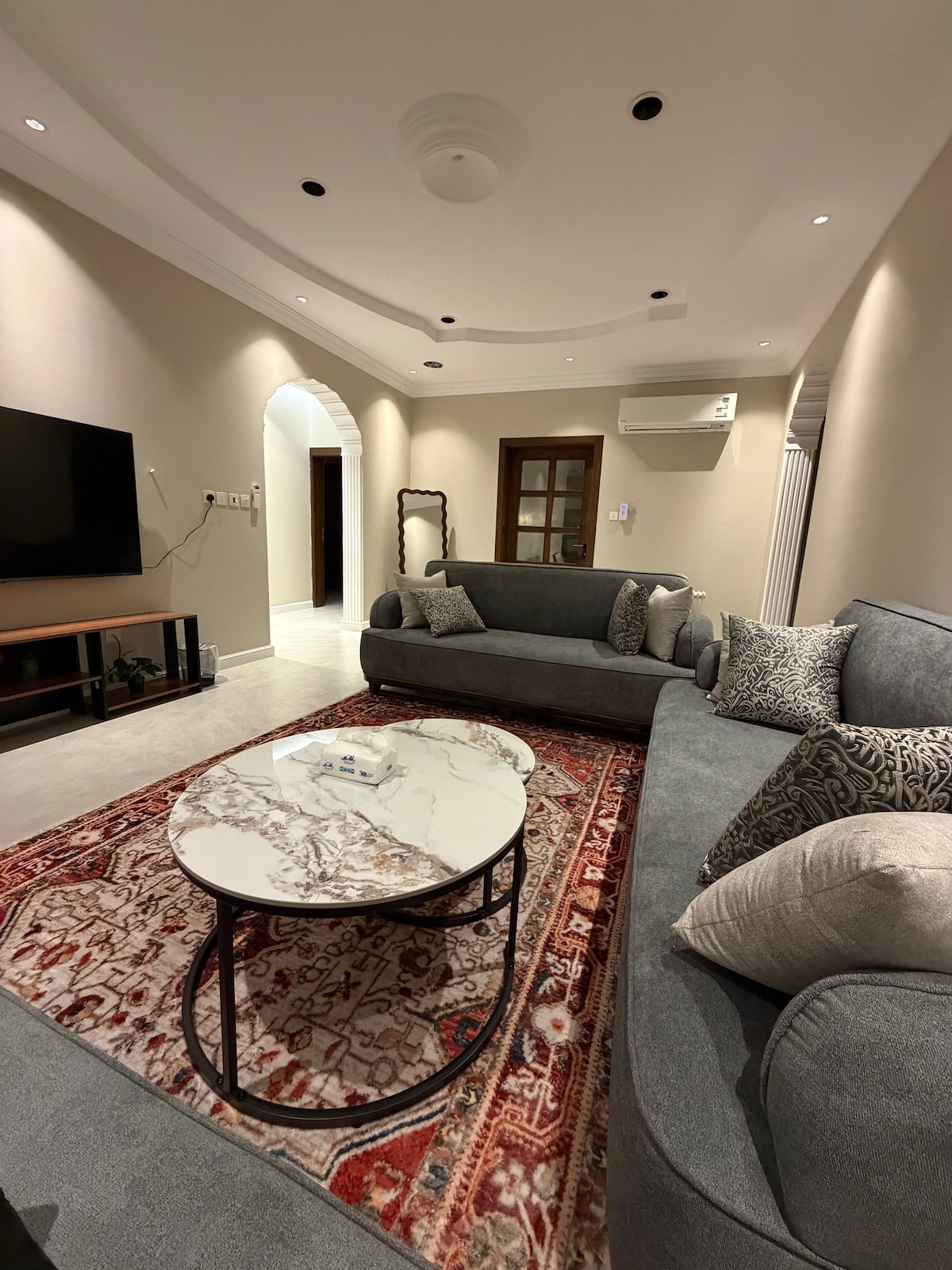 Bienvenidos El apartamento consta de dos cómodas habitaciones, un amplio salón con asientos y un patio al aire libre que tiene la sesión al aire libre perfecta para relajarse o disfrutar del ambiente nocturno. El apartamento está equipado con todas las necesidades básicas que garantizan una estancia cómoda y cuenta con un gran espacio para la comodidad de la familia y para las actividades. La ubicación es tranquila y segura, centralizada y cerca de servicios e instalaciones básicos, por lo que es una opción ideal para familias o viajeros que buscan comodidad e independencia. Cerca del centro comercial Tera ( 5 minutos ) Cerca del centro comercial del jurado ( 5 minutos ) Cerca del parque Al Rukhaf ( 10 min )