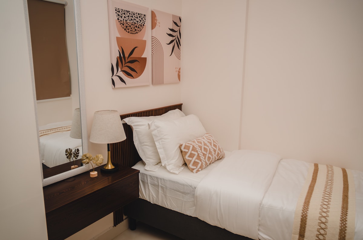 Relájate en un espacioso apartamento de 3 dormitorios con baños privados, balcón privado e impresionantes vistas al mar. Disfruta de acceso a una piscina infinita en la azotea, gimnasio y salón de billar. A solo 10 minutos del aeropuerto. Cocina totalmente equipada, Wi-Fi, Netflix y lavadora incluidos. Perfecto para familias, grupos o escalas cortas. Camina hasta la terminal de ferry, observa las puestas de sol en la azotea y comienza el día con un café en el balcón”.