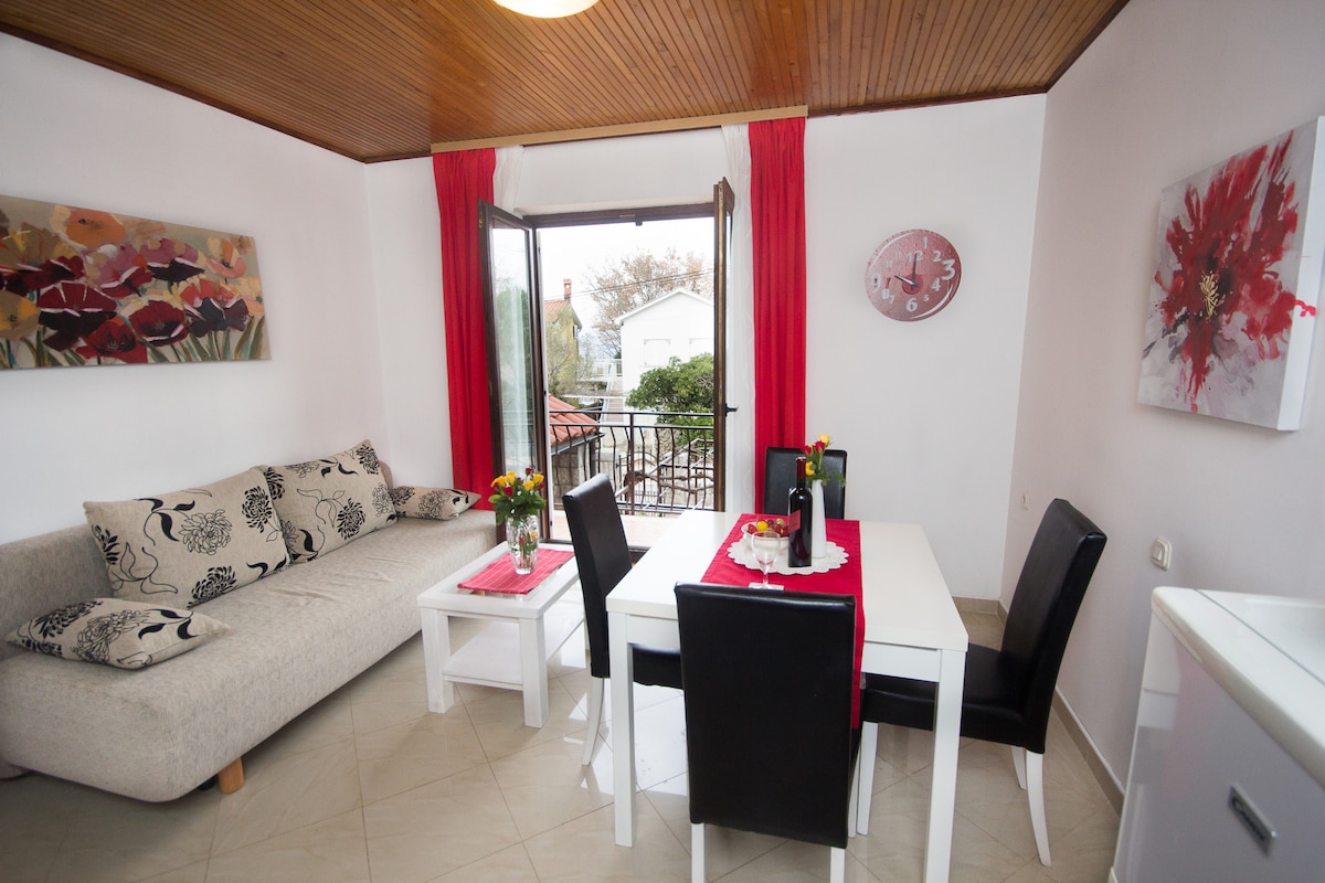 A cozy apartment located within 10 walking minutes from the nearest beach and center of Malinska. The apartment features a living room/kitchen (equipped with sofa for 2 extra persons at add. cost), 1 bedroom, bathroom and balcony with sea view. The kitchen is fully equipped (dishes, microwave, eletric kettle etc). Linens, towels, parking lots, WiFi are provided and free of charge. Please read the instructions in a reference to air condition usage.