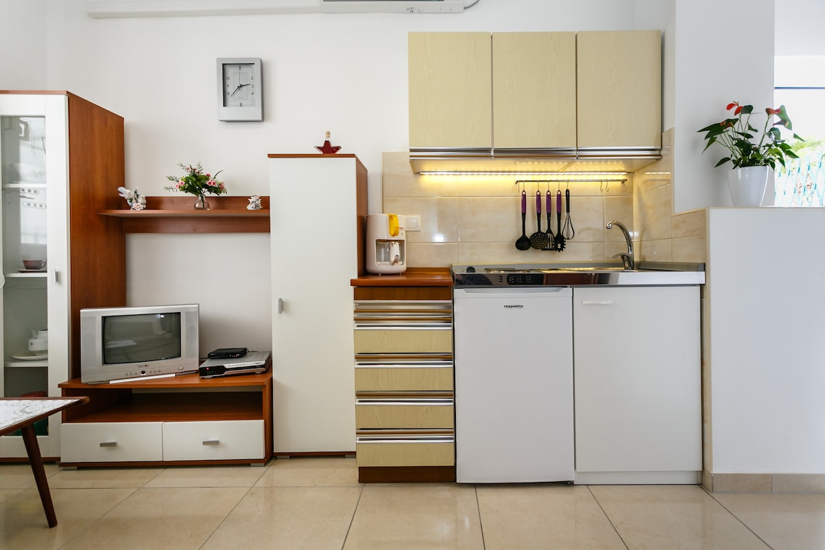 El departamento está en la planta baja de la casa, rodeado de vegetación y tiene una terraza genial. A la playa a 150 m, al centro y a las tiendas a unos 300 m. Estacionamiento en el patio. El departamento tiene dos habitaciones, una más grande con una cama doble y una más pequeña con dos camas individuales. La cocina está equipada: refrigerador, peluquería, microondas, hervidor, estufa de gas, platos y cubiertos. Baño con ducha y inodoro. Aire acondicionado. Las mascotas son bienvenidas (5 €/día). Impuesto turístico por persona 1.5 €/día. Mi teléfono: +385915492611