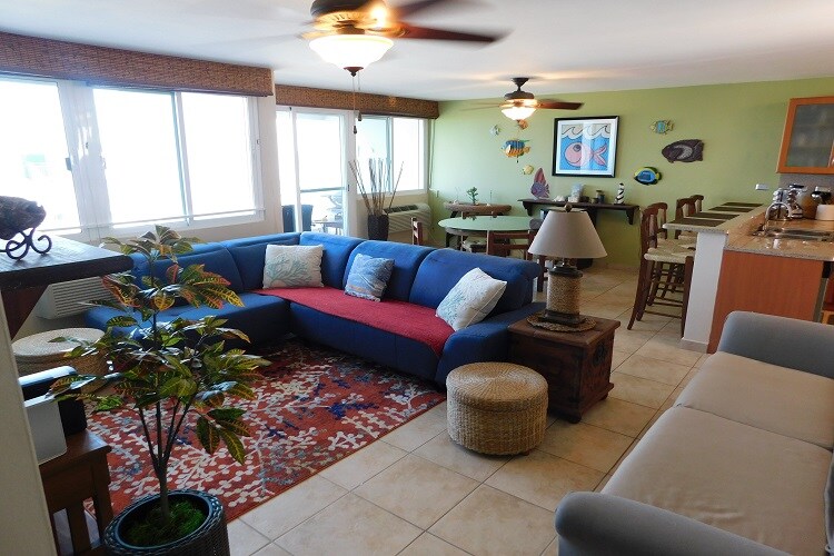 Duerme con el sonido de las olas en nuestro apartamento de 2 dormitorios y 2 baños frente al mar. Está muy bien amueblado y totalmente equipado con 2 camas tamaño queen y 2 cómodos sofás cama de tamaño completo. ¡Disfruta de las comidas en el balcón con vistas al mar! NOTA: Nuestro muro del mar tuvo que ser reconstruido después del huracán María. Se instaló una puerta al mar, pero aún no se han instalado las escaleras. No te preocupes, el acceso a la playa está disponible a través de la cancha de baloncesto comunitaria (3 puertas más allá de nuestra propiedad).