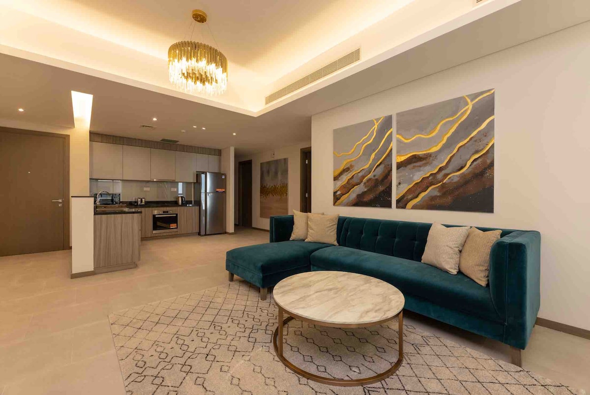 Beachfront Bliss! Private Apartment in 5-Star Resort (The Address Bahrain) Live the dream! Our 1BR suite in a stunning beach resort offers a king bed, ensuite bath, & a fully-equipped open kitchen. Relax in the living area or on the shared patio w/ garden views. Resort boasts pool, restaurants, private beach, spa, gym, cafes & Marassi Galleria mall access! Free parking, 24hr room service & cleaning included. Book your oasis!