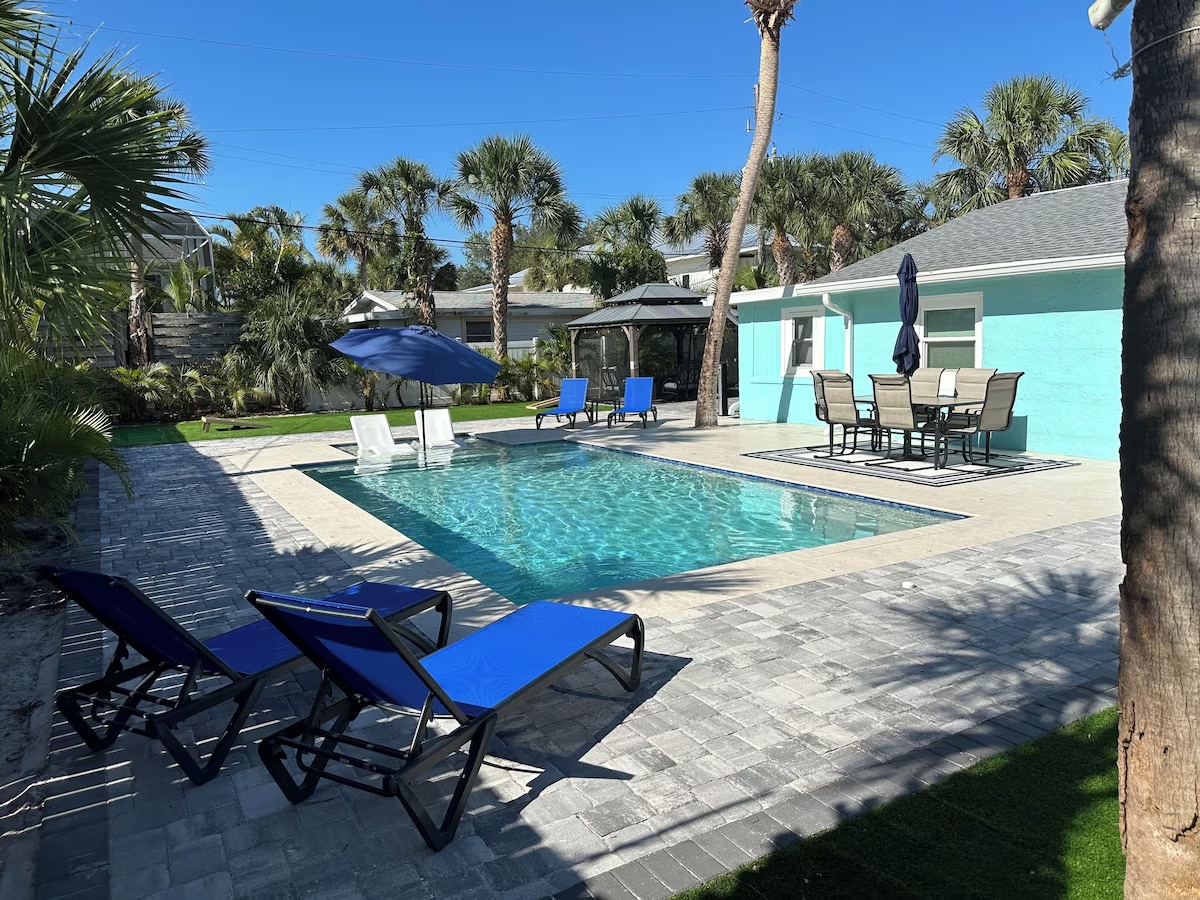 4 casas NUEVAS separadas en el interior (renovadas 12/24) 2 habitaciones y 2 baños (+ sofá cama tamaño queen + silla/cama) casas de piscina (cada una tiene capacidad para 7 personas) A SOLO 4 MINUTOS A PIE DE LA PLAYA SIESTA KEY #1 en EE. UU. (no hay calles principales que cruzar): ¡primera clase! 2 piscinas climatizadas, 2 jacuzzis, 2 gimnasios, televisores inteligentes en todas las habitaciones, sábanas finas, toallas, bicicletas, equipo de playa, porche privado, parrilla, chimenea, ducha al aire libre, estacionamiento privado: excelentes restaurantes / vida nocturna a poca distancia a pie. Correr/caminar: ¡tienes kilómetros de playa para disfrutar!