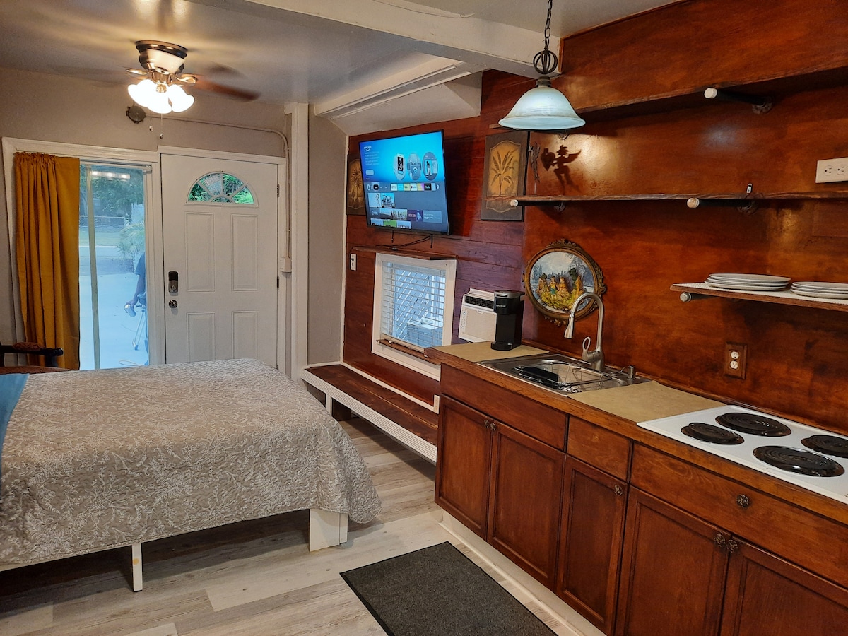 Esta unidad asequible es de aproximadamente 450 pies cuadrados de eficiencia que incluye una gran cama tamaño king y baño, nevera completa, microondas, dispensador de agua y cafetera. Esta unidad no tiene cocina, pero hay acceso a una parrilla de carbón. Designado para estacionamiento en la calle. Hay un televisor inteligente/Roku con WIFI rápido. Esta es una unidad adjunta ubicada en el centro de Bradenton. Está a la vuelta del paseo fluvial, bares y entretenimiento. Cerca de playas. Ideales para parejas o un solo viajero.