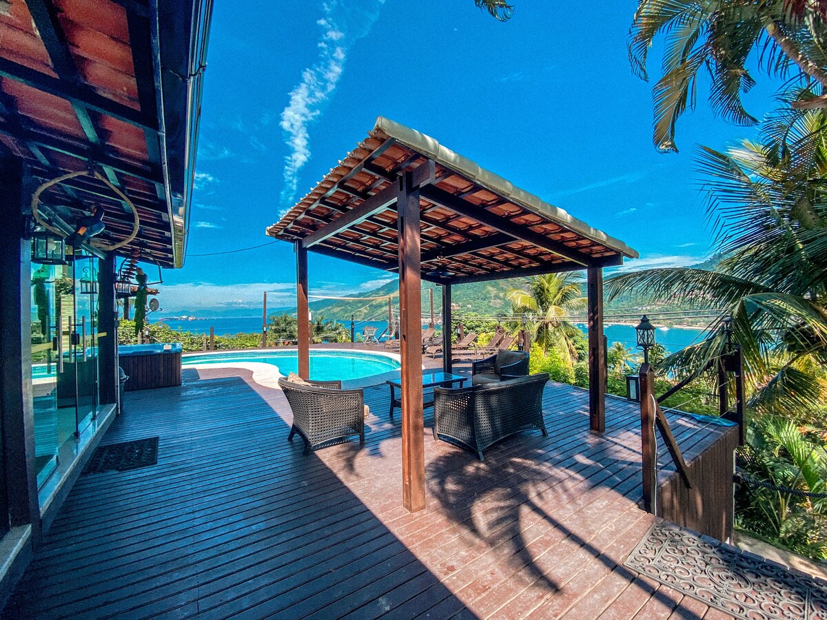 Frente a Ilha Grande (PATRIMONIO MUNDIAL DE LA UNESCO) - Casa con 5 dormitorios con aire acondicionado, 3 salas de estar, un balcón superior con mesa de cartas y hamaca, balcón inferior con barbacoa, terraza con piscina, vista a Ilha Grande desde todas las habitaciones, sauna, cancha de fútbol exclusiva, cocina completa. Situada en el condominio Portogalo, total seguridad y mucha privacidad, cuenta con TV por cable e internet wifi. ¡La playa de Cazuza está muy cerca de la casa y ofrece un maravilloso baño de mar!