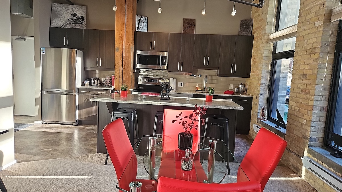 Un loft moderno y de techo alto diseñado para la comodidad. Totalmente equipado, bien preparado y acogedor durante todo el año. ¡PLAZA DE ESTACIONAMIENTO GRATUITA con seguridad presencial 24/7 INCLUIDA! Pasos a Jets Arena, Historic Exchange District, The Forks. Acceso directo a ALT Hotel, The Merchant Kitchen, Brown's Social House y Tim Hortons. El Centro de Ciencias de la Salud está a pocos minutos. El personal de seguridad del edificio patrulla todos los pisos, con cámaras en los ascensores y pasillos, y hace cumplir estrictamente el silencio y las reglas.
