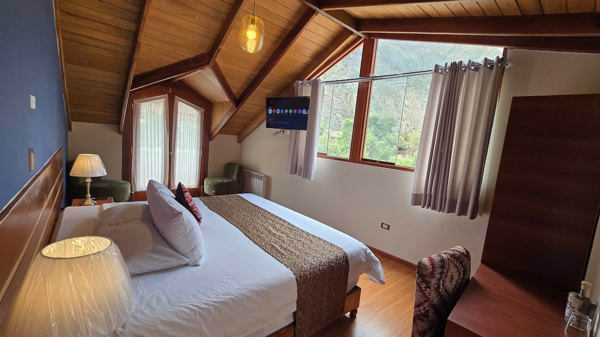 Nuestra amplia suite King cuenta con un plano abierto con sala de estar y sofá cama, un baño con lavabos dobles separados de la ducha y el inodoro, y puertas corredizas del piso al techo que se abren a un patio privado en el segundo piso con impresionantes vistas a la montaña. Los huéspedes disfrutan de la intimidad de un entorno boutique, perfecto para relajarse después de explorar Ollantaytambo, Machu Picchu y más allá, mientras disfrutan de vistas serenas y una profunda conexión con la naturaleza.