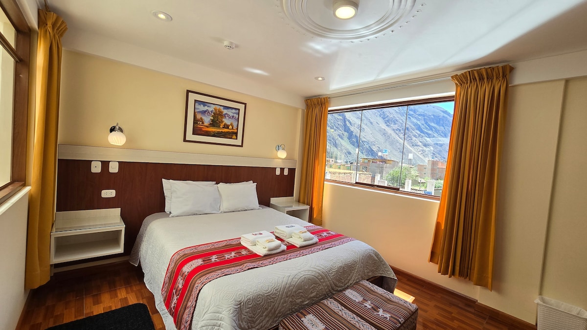 Hotel tranquilo y bien ubicada en Ollantaytambo: a pocos minutos de la Plaza y muy cerca de la estación de tren, con acceso vehicular hasta la puerta. Habitación interior, silenciosa, con cama doble 1.35 m, baño privado y agua caliente 24/7. Wi‑Fi rápido, TV con cable, calefactor y hervidor; incluimos toallas, shampoo y jabón. Contamos con una hermosa terraza con vista increible y una cocina/comedor de libre uso. Desayuno incluido (box para salidas tempranas). Ideal para 1–2 huéspedes.