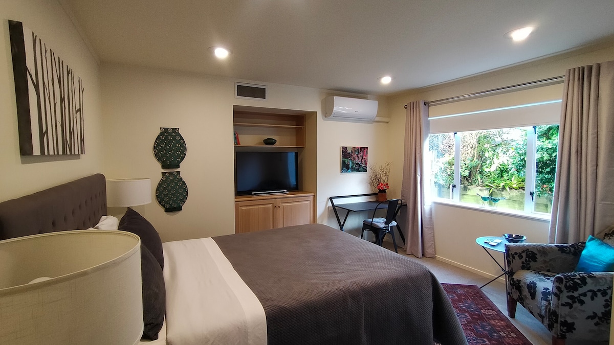 Elegante, acogedor y privado. Decorada con buen gusto para proporcionar comodidad y lujo. Disfruta de excelentes comodidades como wifi de alta velocidad, televisor inteligente, aire acondicionado, lavadora y plancha, baño elegante con ducha a ras de suelo, cocina americana equipada para preparar tus comidas, escritorio y espacio para guardar tu bicicleta o equipaje. La zona es genial, cerca de los jardines botánicos de Auckland, parques, tiendas, restaurantes, cafés, acceso a autopistas, trenes, autobuses, centros comerciales, parque temático y aeropuerto.