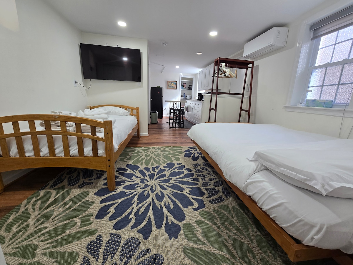 ¡DISFRUTA DE UN fin DE SEMANA COMPLETO por LA tarde del viernes AL domingo AL final DE LA tarde! PISO SUPERIOR PRIVADO de 1 dormitorio con BAÑO PRIVADO en el pasillo justo fuera de tu habitación. La sala del piso principal con cafetería y microondas amplía tu espacio. Disfruta de tu café por la mañana en el porche delantero común con mecedoras y mesa y sillas con vistas a las tiendas. Patio y jardines con barbacoa. Opciones para cenar, servicio de autobús y tren de cercanías, tiendas, galerías y playas a pocos pasos. ¡Ubicación perfecta! En el estacionamiento de la calle.