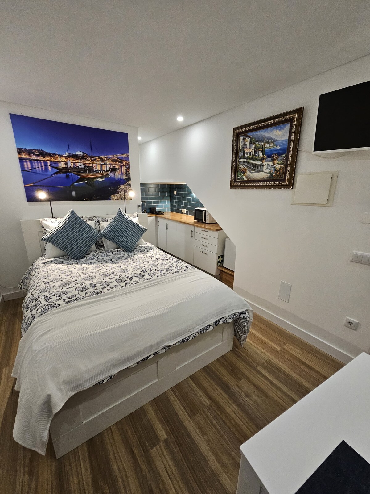 A romantic suite for two with 2 PRIVATE TERRACES offering AMAZING VIEWS of Porto, the Douro River and Dom Luis bridge. The appartment is located only 2 minutes walk from the world famous Port Wine Cellars. Dom Luis bridge is cloose and the best waterfront bars and restaurants nearby. With fully equipped kitchen, ensuite shower and comfortable double-bed with soft linens, it is the perfect location to relax after exploring Porto! Welcome to Gorans Guesthouse! The terasse expand about + 80 %