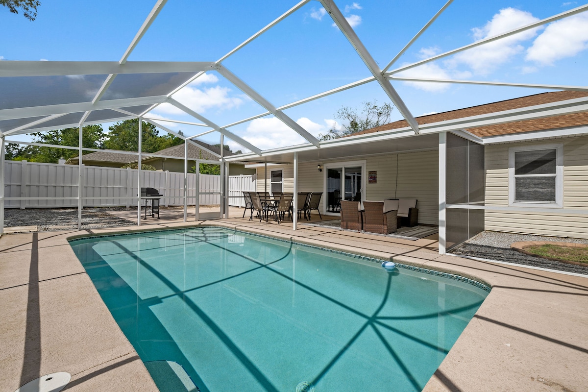 Bienvenido a Henry's Hideaway, un relajado refugio en Ocala donde las familias, los amigos y los cachorros pueden extenderse, relajarse y disfrutar del tiempo juntos en una propiedad tranquila y cercada rodeada de naturaleza. - Capacidad para 9 personas | 3 dormitorios | 5 camas | 2 baños - Piscina privada al aire libre, disponible todo el año. - Sala de juegos independiente con mesa de billar, juegos de arcade y TV - Lanai con mosquitero, chimenea, parrilla y patio trasero cercado - Cocina totalmente equipada, wifi y espacio de trabajo dedicado. - Apto para mascotas y familias con sala de juegos para niños.