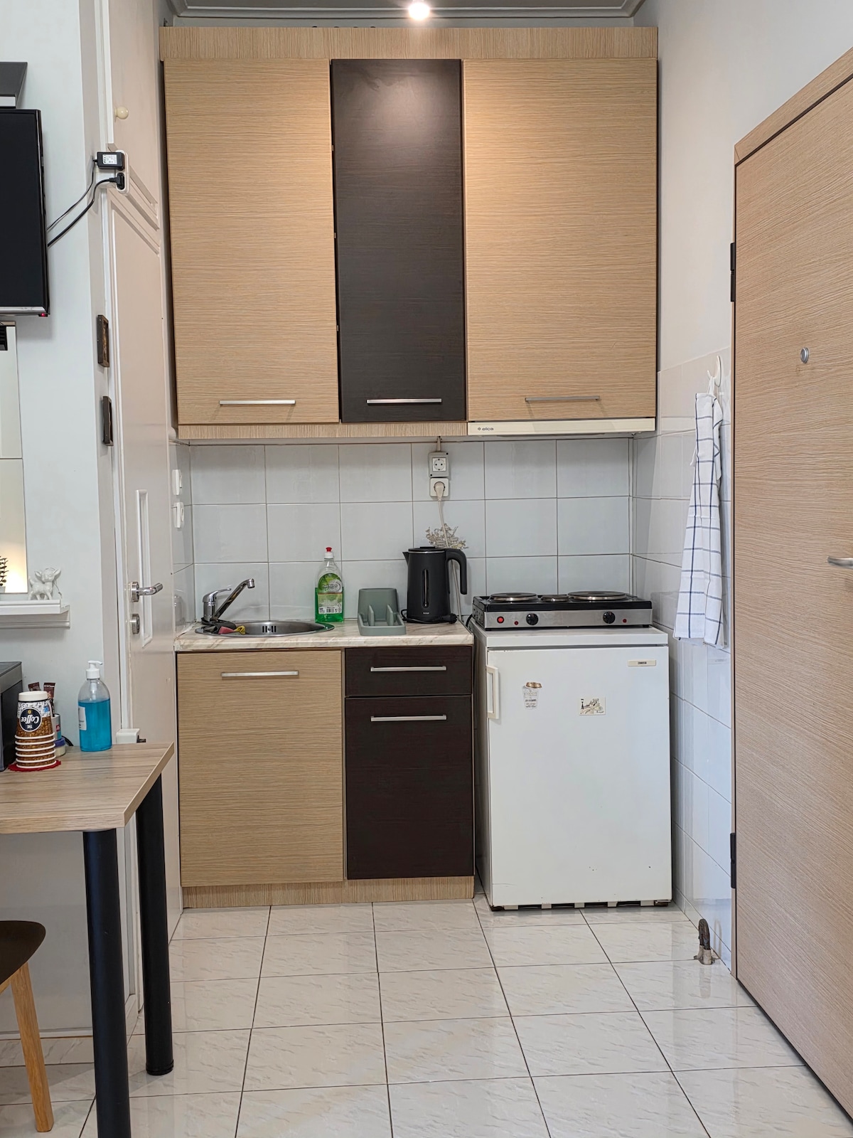Nice, comfortable little studio 25m2 on the second floor, with central heating, bathroom and balcony, two beds, a large wardrobe, dining table, fridge and a fully equipped kitchen. 5’ walking from Amarousion Metro Station, 20’ travelling to the center of Athens, and 15'-20' from Athens International Airport by metro. Two metro stations to the Athens Olympic Stadium and to the Athens Mall. 10’ walking to the down town of Amarousion with a variety of shops, super markets and restaurants.