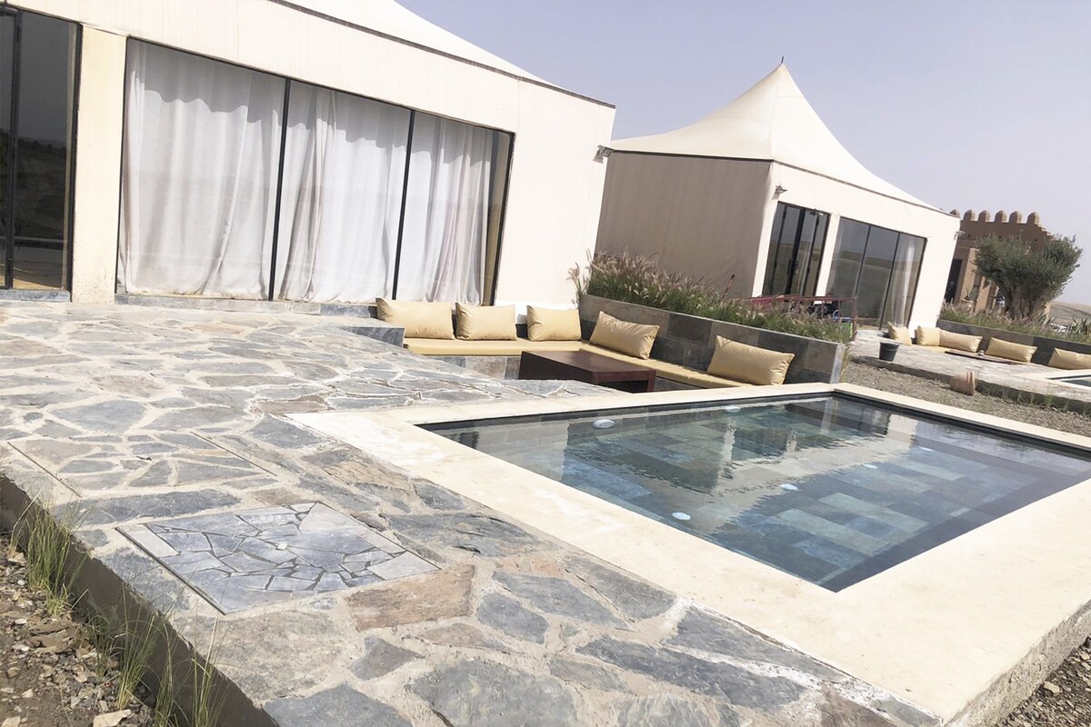 Tienda de campaña en el desierto de Agafay con piscina y vistas al atardecer
