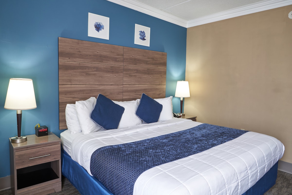 La cómoda habitación estándar recientemente renovada cuenta con una cama tamaño king y un televisor de pantalla plana de 50 pulgadas. Puedes disfrutar de servicios en la habitación como nevera, microondas, despertador con radio, gran área de escritorio y temperatura del aire controlada para tu máxima relajación.