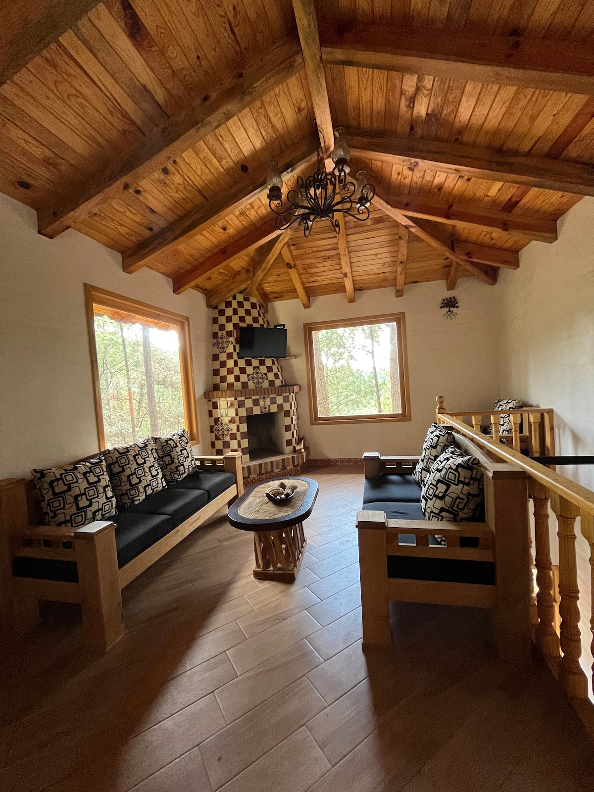 No olvidarás tu estancia en este lugar romántico. Con Sala, Barra Desayunador, chimenea, un baño completo. Cocina equipada (refrigerador, licuadora, micro-hondas,utensilios basicos para cocinar y comer), carga de leña,, TV-SKY,, toallas, covertores, jabon, shampoo, agua purificada, Tapanco: Cama Matrimonial y Cama Individual, su acceso es por medio de escalerilla tipo Marina, (no recomendable para personas de la tercera edad, Niños menores de 8 años.
