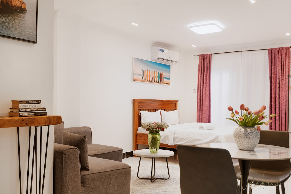 ¡Te damos la bienvenida a tu tranquilo refugio costero! Este encantador espacio decorado con buen gusto ofrece comodidad sencilla pero elegante, escondido en un complejo sereno para una relajación total. A solo 2 minutos a pie de Mwai Kibaki Road y a 10 minutos a pie de la playa pública, está perfectamente ubicado tanto para la comodidad como para la tranquilidad. También encontrarás tiendas, restaurantes y otros servicios esenciales a la vuelta de la esquina, por lo que es una estancia ideal, ya sea que estés aquí por placer o por negocios.