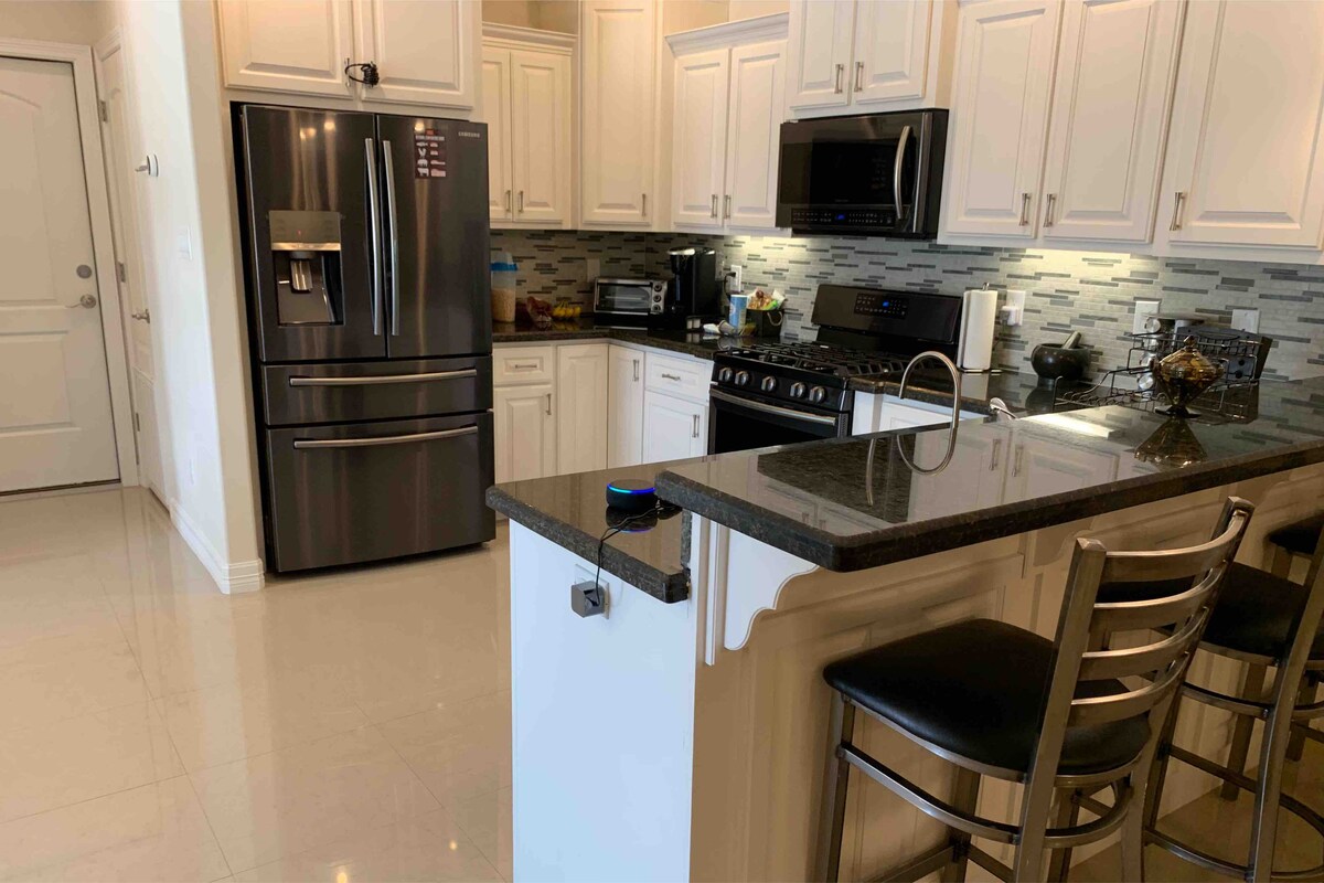 Comunidad cerrada con un campo de golf y patrullas de seguridad nocturna. La casa adosada tiene 3 dormitorios: una suite grande con cama tamaño king, una habitación de invitados con cama tamaño queen y una habitación de invitados con sofá cama y sala de cine. La cocina completa tiene electrodomésticos de primera calidad, dos mesas de comedor, agua filtrada y asientos en la barra. El estacionamiento incluye un garaje para un solo automóvil, una entrada y una calzada en la cuadra. Unidad combinada de lavadora/secadora. Internet de fibra óptica. Cancelación flexible para trabajadores estatales y federales.