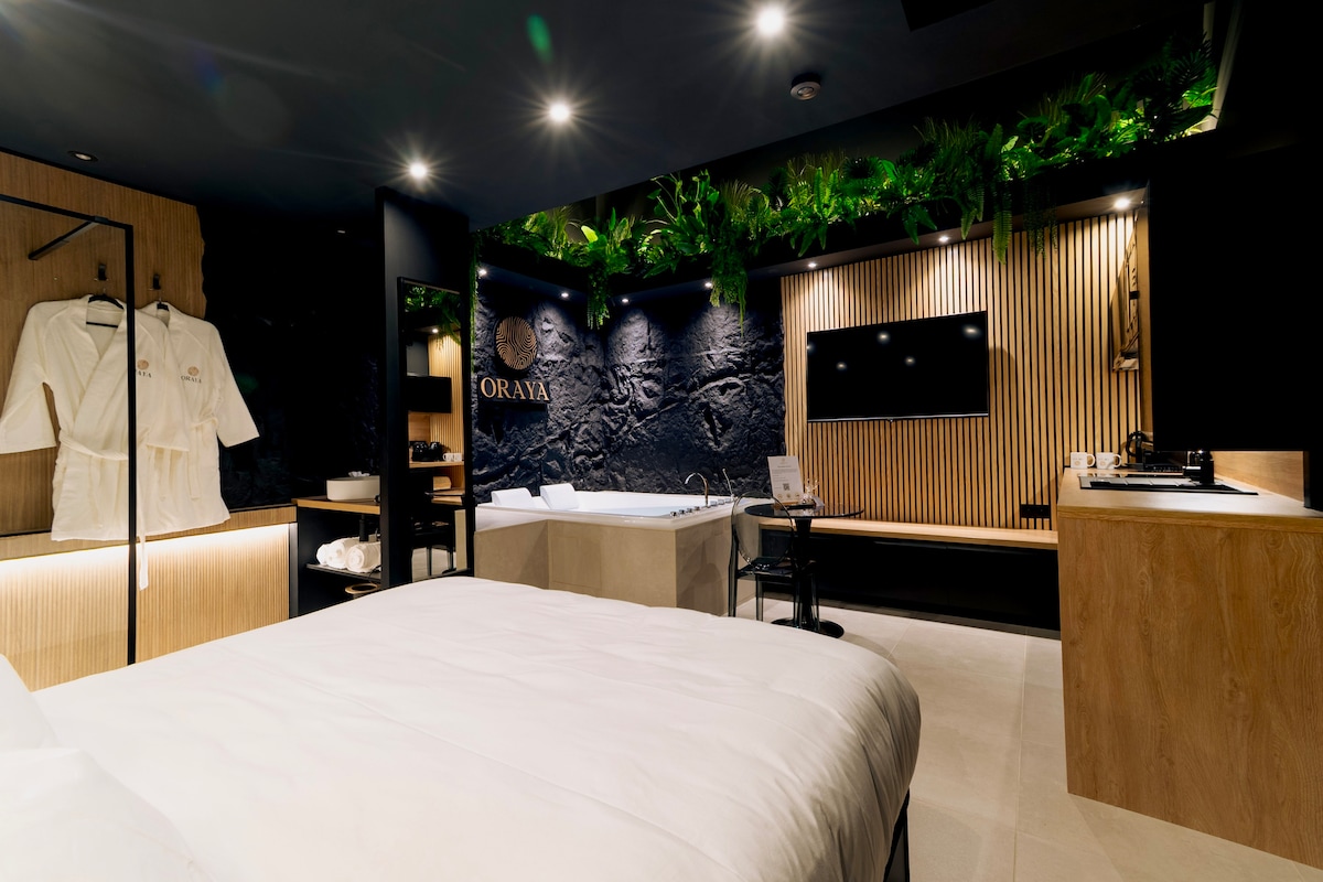 ¡Bienvenido a Oraya Suite! Una suite con carácter, pensada como un entorno íntimo y refinado, para ofrecerle un ambiente lujoso, moderno y envolvente. Siéntese cómodamente y disfrute de un espacio de cine inmersivo, perfecto para sus noches de películas y series. Sonido, imagen, ambiente acogedor: todo está reunido para vivir el cine… ¡mejor! Cada detalle ha sido pensado para ofrecer una experiencia única para una estadía atemporal. ✨️Reserva y disfruta✨️