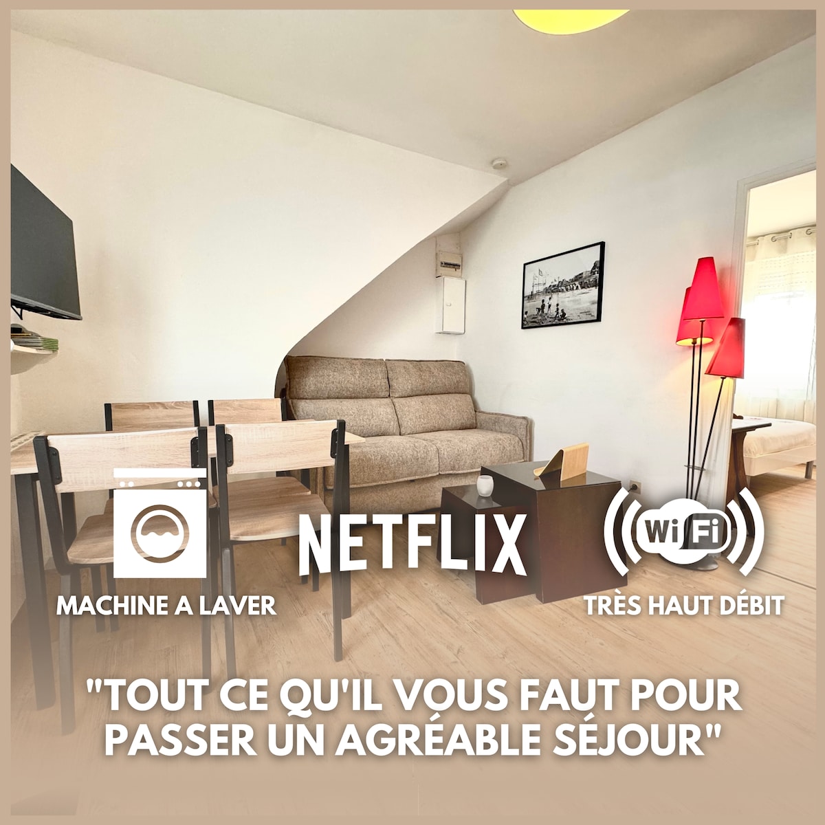 En el corazón de Merlimont-Plage. Apartamento de dos ambientes de 40 metros cuadrados, reformado, totalmente equipado y espacioso. En el primer piso de una pequeña copropiedad en una calle tranquila y gratuita para estacionarse. Está idealmente situado cerca de todos los servicios, restaurantes, bares y panadería. Todo a menos de 150 metros. - Cama y colchón de gama hotelera 160x200 - Cocina equipada (hervidor de agua, tostadora, cafetera Nespresso) - Se proporcionan sábanas y toallas a 10 min de Touquet y Berck