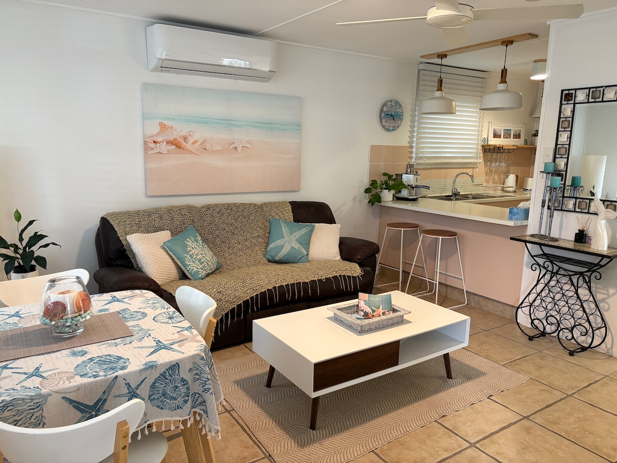 Esta propiedad es una unidad espaciosa de un dormitorio, independiente con un patio trasero, situada a 100 metros de las playas de arena de Mermaid y Nobby's. La unidad se encuentra en una calle tranquila con aparcamiento gratuito en la calle y fácil acceso al transporte público. La entrada de la puerta principal y la ducha de la playa delantera (agua fría) son compartidas y los huéspedes utilizan una puerta con teclado separada para acceder a su apartamento, que se encuentra debajo de la casa principal. Este apartamento es exclusivamente para tu uso.