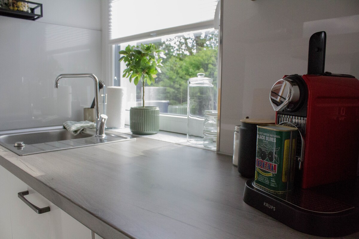 Wohnzimmer mit Blick ins Grüne, kleiner Arbeitsbereich. Schlafzimmer mit einem Frenchbed (140x200), Bettwäsche wird gestellt. WiFi Einbauküche mit Kühlschrank (mit Eisfach**), Induktionskochfeld, Mikrowelle/ Heißluftbackofen. Spülmaschine. Senseo-Kaffeemaschine. Bad mit Dusche und WC, Handtücher, Föhn, Fußbodenheizung Unterstell- u. Lademöglichkeit von Rädern auf Anfrage Kurzwäsche, Trockner auf Anfrage und gegen Gebühr im Haupthaus Terrasse mit einfachem Grill