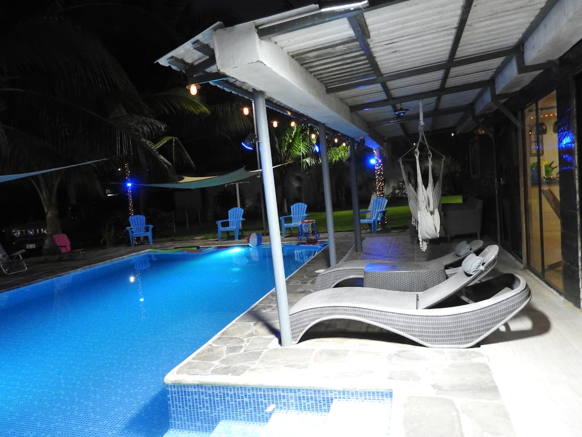Escápese del estrés de la vida en esta rancho recién renovada ubicada en el corazón de Costa Azul. Nuestra casa duerme 12 personas y con 3 bungalows con un total 10 camas (todas con aire acondicionado) y 3 baños completos. La piscina se encuentra en el centro de la casa, con hamacas, sillas adirondacks y palmeras, e incluye una cocina completa, área de barbacoa, área hamaquero y baño común. Lo mejor de todo es que estamos a solo 5 minutos caminando a la hermosa playa de Costa Azul.
