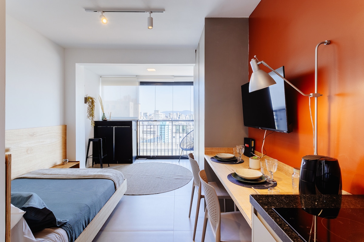 Estudio diseñado por la arquitecta Ketlyn Melero, planta abierta y moderna en el piso 28 del icónico Edificio Copan con vista panorámica, brindando el escenario ideal para que su estadía sea inolvidable. El Copan es uno de los edificios más importantes y emblemáticos de la ciudad de São Paulo. Es un símbolo de la arquitectura moderna brasileña, diseñado por el arquitecto Oscar Niemeyer.