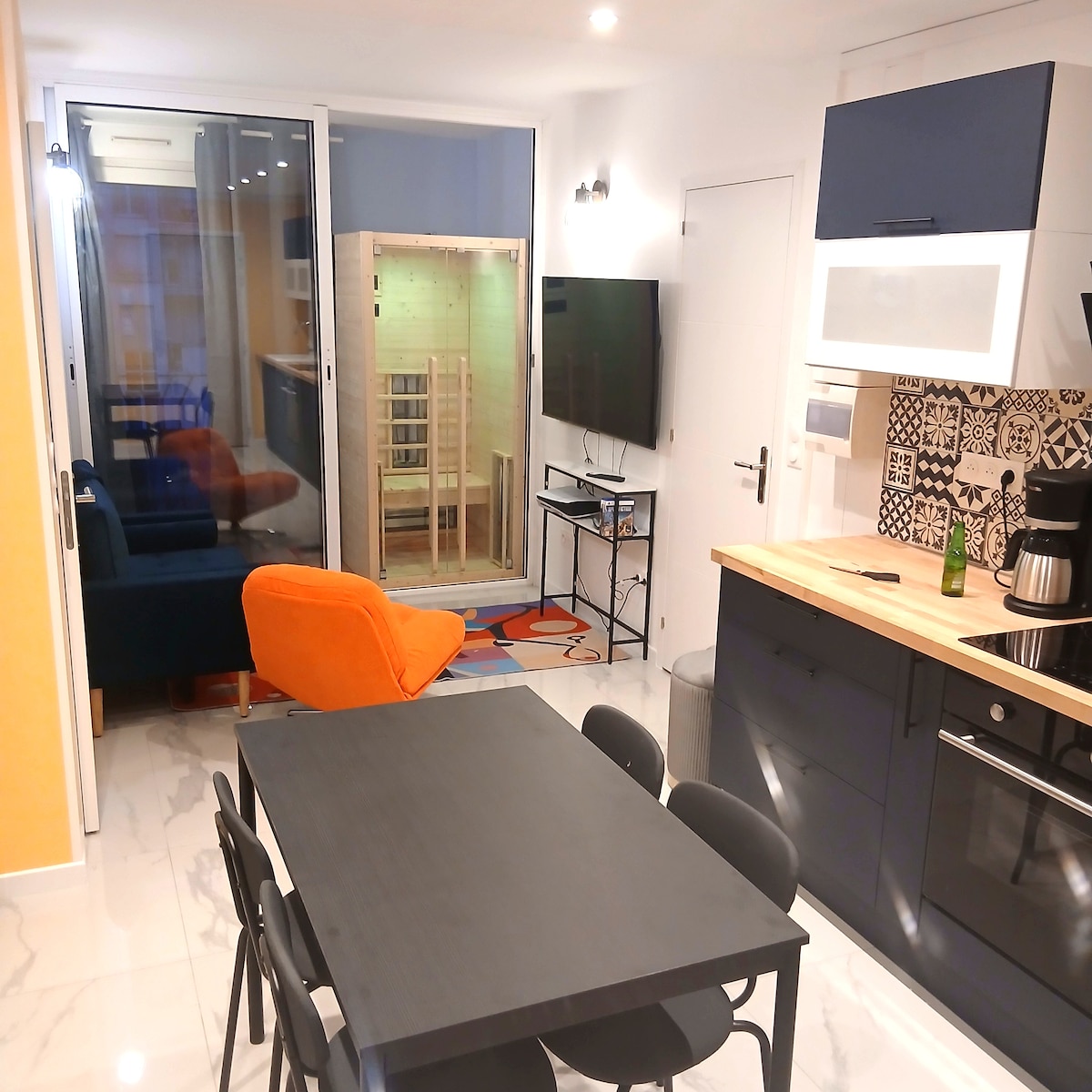Este alojamiento tiene un estilo decididamente único. Un apartamento de alto standing para momentos de relajación e intimidad en un contexto lujoso. Una sala de estar abierta a la cocina equipada con un proyector de vídeo gigante y un cine en casa para sumergirse por completo en una noche de relax. Amplia habitación con una cama QueenSize (160x200) de lo más cómoda. Un lujoso baño con ducha a ras de suelo que incluye un jacuzzi para 3 personas y una sauna para 3/4 personas con acceso directo a la habitación.