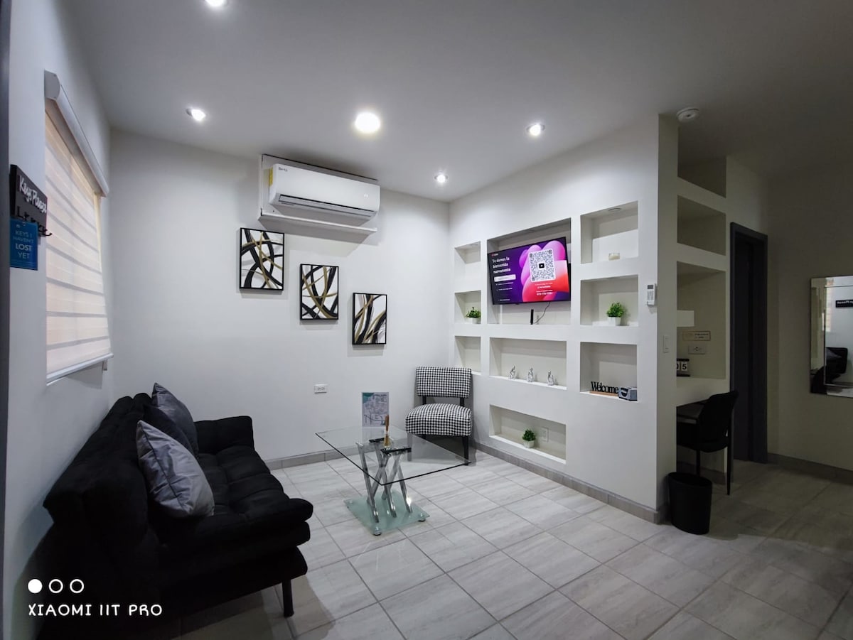 Con estacionamiento privado y seguro. Tour Virtual disponible escaneando codigo en el area de fotos - Estacionamiento privado - Puertas con clave de seguridad - Cocina completa y barra, refrigerador, estufa, cafetera, micro ondas, vajilla completa - 1 Recamara con armario, escritorio, cama Queen y cobertores - 1 Baño completo, shampoo y jabón, toallas - 1 sillón cama y Smart TV, Netflix - A 1 cuadra de avenida independencia, a 5 minutos de avenida justo sierra