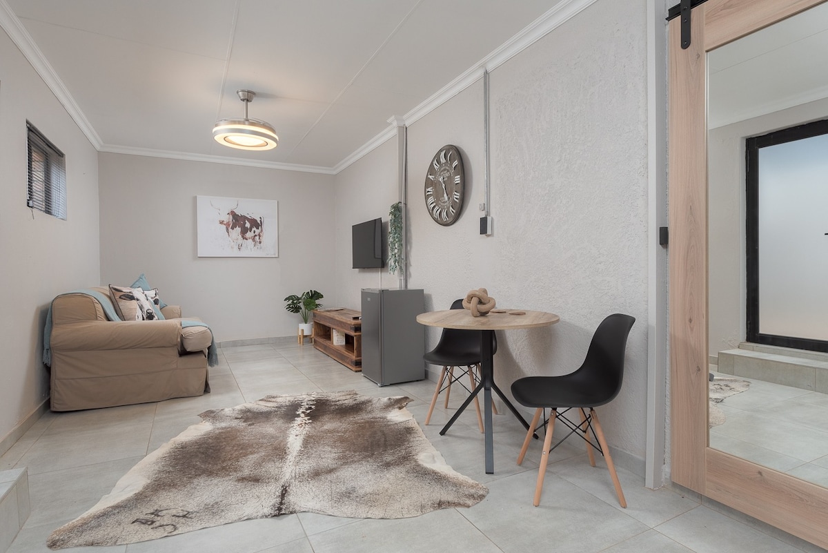 Entorno seguro, aparcamiento detrás de la puerta automatizada con cama doble y baño. Entrada privada con nevera bar, cafetera y tetera. TV y mando a distancia propio de DSTV. Wifi gratuito limitado a 5 Gig. Relájate en el patio y observa a las gallinas deambular libremente por la propiedad compartiendo el espacio con una maravillosa vida de aves. Cerca del hospital Midvaal y del centro comercial Three Rivers.