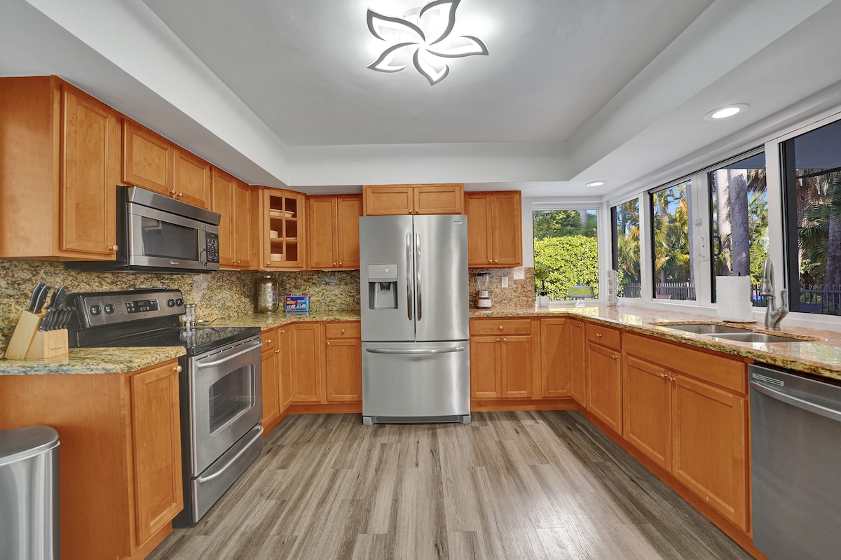Ubicada en el barrio de los lagos del este de Hollywood, nuestra casa está a solo 2 manzanas del increíble paseo marítimo de Hollywood Beach y a 3 minutos del centro de la ciudad. Increíbles vías fluviales rodean nuestro barrio, perfectas para pasear al atardecer. Nuestra casa está superlimpia y actualizada. Disfruta de un gran patio vallado, piscina, mesa de ping pong, parrilla, cocina de gas y una cocina totalmente equipada. También disfrutarás de nuestros increíbles muebles de exterior y de un televisor inteligente de 75 pulgadas en el que podrás ver tus programas favoritos. Perfecto para relajarse.
