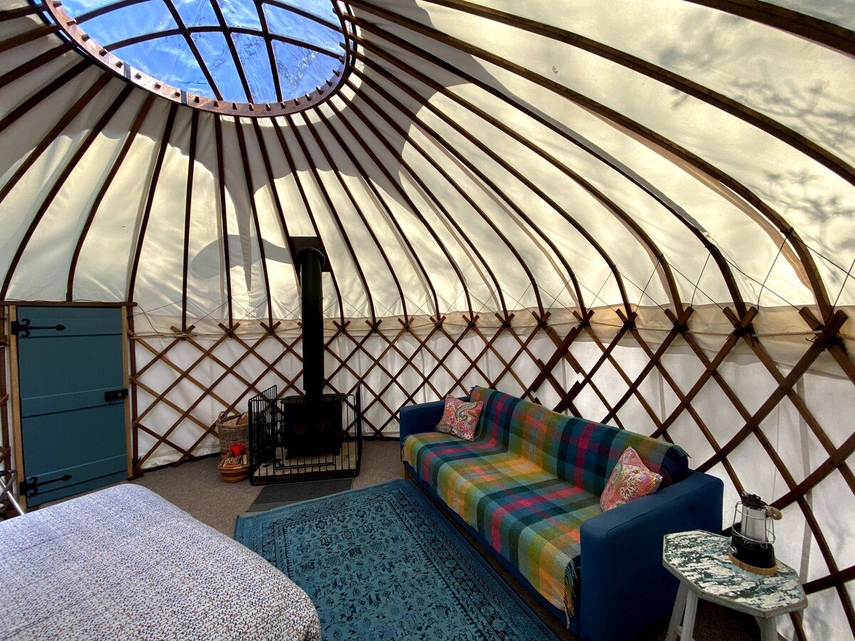 Encontrarás The Teasel Yurt escondida en el lateral de Selsley Common. La gran terraza da al valle de Severn y las colinas de Stroud, espectaculares en todo tipo de clima y un lugar estupendo para ver el atardecer. La yurta en sí tiene una capacidad máxima para 5 personas y cuenta con ropa de cama y toallas. Hay un quemador de leña para mantener la yurta acogedora cuando hace frío y la cocina al aire libre tiene un techo de lona, un quemador de gas, un fogón/barbacoa, un fregadero y una nevera. El baño tiene ducha caliente y retrete de compostaje.