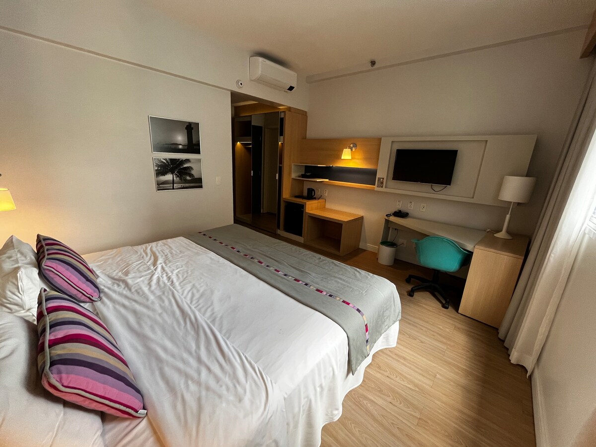 Apartamento mobiliado, apenas 230 metros da praia, menos de 3 minutos a pé. Roupa de cama, toalhas, ar condicionado, TV a cabo, wi-fi, cofre digital, secador de cabelo. Acomoda confortavelmente 4 pessoas, com uma cama de casal no quarto e um sofá cama na sala. Para maior conforto, o Flat conta com recepção 24 horas facilitando o check-in ou check-out, excelente café da manhã (pago a parte), piscina, academia e limpeza diária, exceto domingos e feriados.