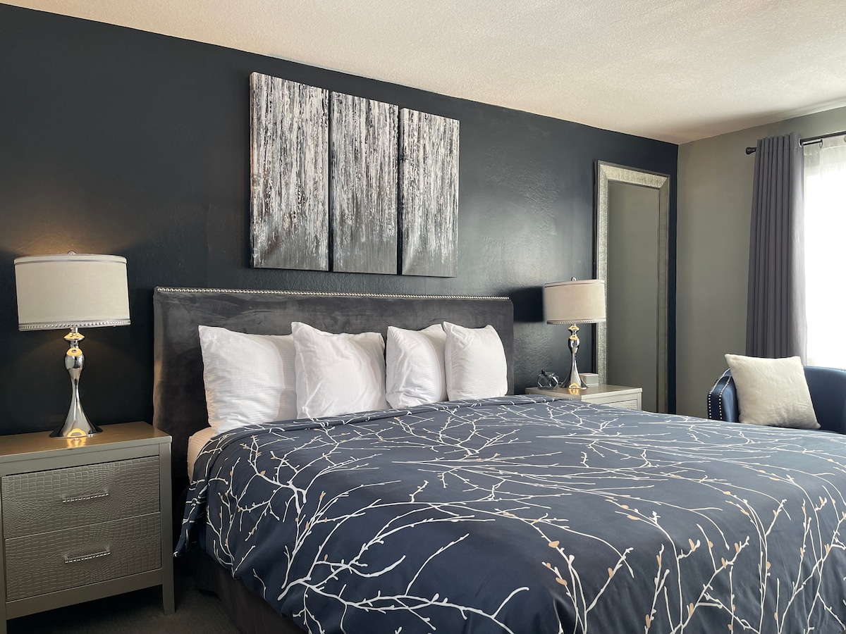 ¡Habitación 1 en The Feather Nest Inn! El motel tiene una mentalidad sostenible, ¡incluidas sábanas y artículos de tocador ecológicos! Este espacio incluye un dormitorio con una cama tamaño queen, un futón para una persona, una cama individual elevada y otra cama tamaño queen en el espacio de estar. Cocina totalmente equipada, desde utensilios hasta ollas y sartenes. Acogedor y cómodo. Se permiten mascotas de buen comportamiento (con una tarifa de $35 por mascota y un acuerdo firmado que estará en la habitación). Ten en cuenta que estas son unidades de pared compartida y el ruido viaja entre espacios.