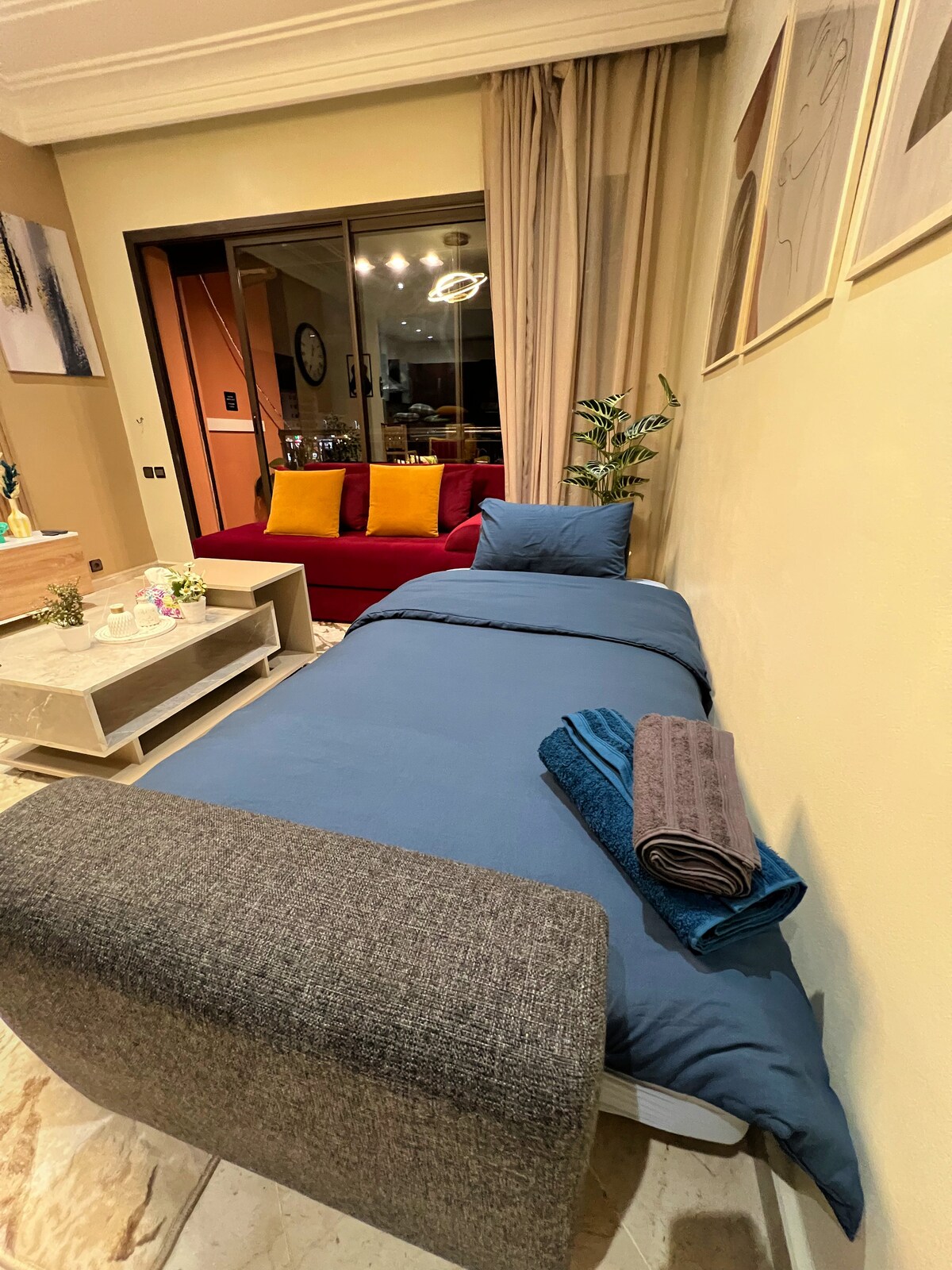 Charming apartment located in the lively neighborhood of Gueliz, close to restaurants, cafés and shops. The apartment is 900m from the train station and about 10 minutes walk from Carré Eden, making it a great base to explore Marrakech. It includes one bedroom with a double bed, a living room with a sofa bed, a private balcony, an equipped kitchen, and a bathroom. Wifi | air conditioner | elevator | security ⚠️ Construction is currently happening in the neighborhood, daytime noise may occur