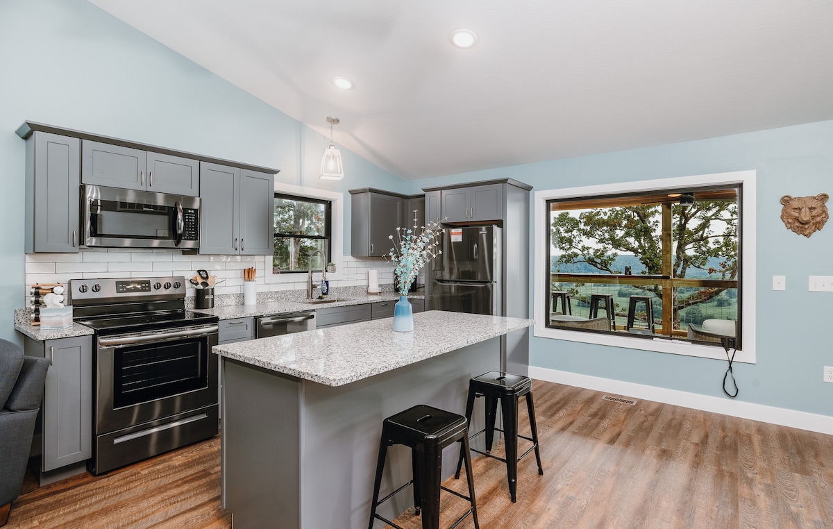 Bienvenido a nuestra hermosa cabaña de lujo en el bosque, más que un lugar para alojarse, es una experiencia inolvidable. Ubicado en 9 acres privados, este refugio personalizado de inspiración escandinava ofrece la combinación perfecta de comodidad y aventura. Si bien la propiedad cuenta con solo una cabaña de huéspedes más cerca, NO HAY SERVICIOS COMPARTIDOS, lo que garantiza que tengas total privacidad durante tu estadía. La cabaña está cerca de Onondaga State Cave Park, Meramec River, Float Trips, bodegas y restaurantes locales.