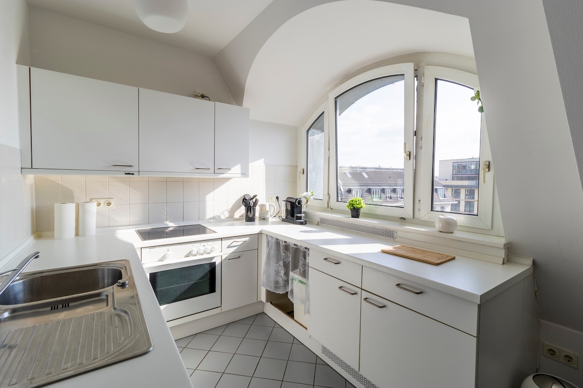 Our light rooftop apartment with its 150 year old wooden beams lies in the middle of a lovely neighbourhood. It comes with a small but stylish kitchen and a luxurious bathroom, equipped with a rain shower and a Finnish sauna. we offer Netflix, cable TV and very fast Internet. Your stay with us will be completely carbon neutraly. The apartment hosts up to three adults or two adults with children.