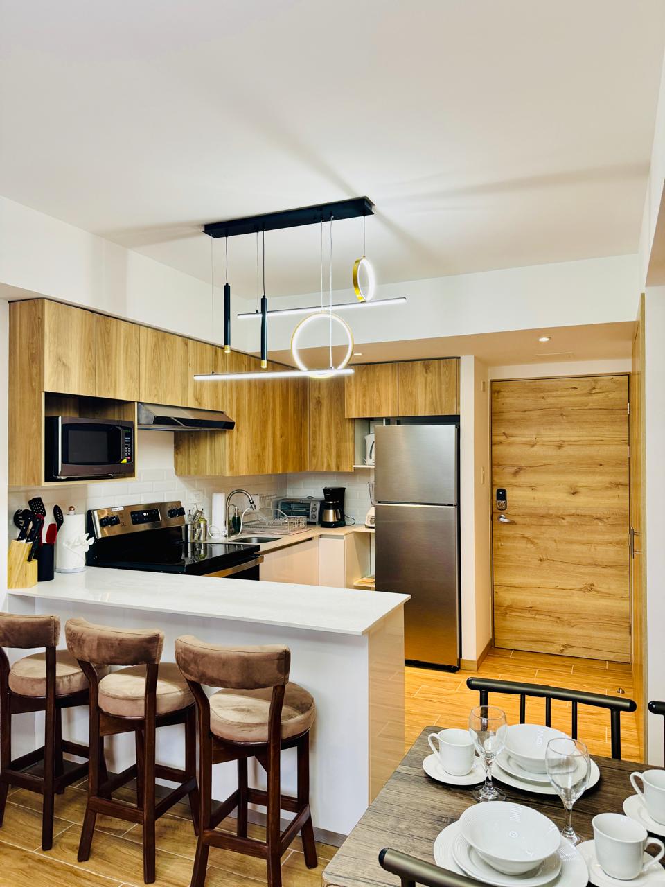 Disfruta de una experiencia elegante en este edificio de apartamentos, céntricamente ubicado, que cuenta con dos habitaciones y dos baños. Este moderno apartamento es ideal para familias, parejas, amigos o personas viajando solas. Cerca de centros comerciales, supermercados, hoteles y restaurantes. Excelentes amenidades en el edificio, como gimnasio totalmente equipado, área de juegos infantiles y áreas de descanso. Incluye 2 espacios de estacionamiento gratuitos.