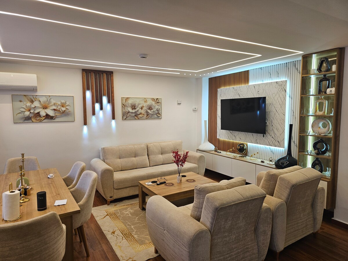 Appartement confortable au Cœur de Tizi-Ouzou. Spacieux 100 m², idéal pour 4 personnes avec 2 chambres (1 lit king-size, 2 lits simples), salon cosy, cuisine équipée et salle de bain moderne. Situé au 3e étage (sans ascenseur), à 5 min du centre de la nouvelle ville et 10 min de la gare. Style minimaliste, très propre, avec vue agréable sur la sortie de ville. Wi-Fi, climatisation et lave-linge inclus. Check-in flexible dès 15h, check-out avant 11h. Non-fumeur, pas d’animaux. IPTV disponible