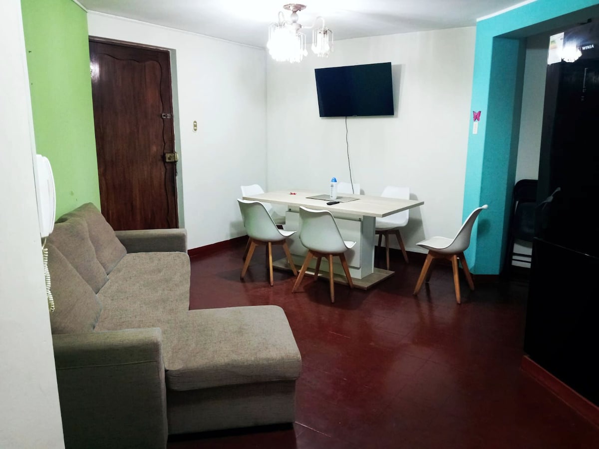 Mini departamento TIPO ESTUDIO AMOBLADO e INDEPENDIENTE SIN RESTRICCIONES DE ENTRADA NI SALIDA 01 habitación con 01 cama de 2 plazas & TV de 32¨, baño privado c/ ducha y agua caliente las 24 hrs. El área de cocina viene equipada con: cocina de inducción, mini refrigerador, hervidor eléctrico, microondas y utensilios básicos de cocina También tiene una pequeña sala BASTANTE ILUMINADA con una MESA PARA TRABAJAR y un sofá INCLUYE agua, luz, internet Wi-Fi VELOZ CON BUENA SEÑAL