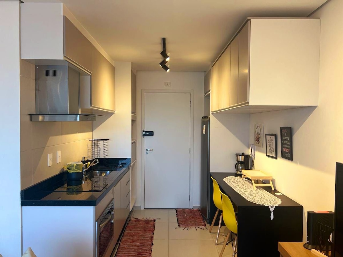 ✨ Studio luxuoso no 20º andar com vista espetacular da cidade e da serra 🌇. Sacada gourmet com home office ✍️, canto alemão 🍽️, TV 50" giratória 📺, ar-condicionado LG Inverter ❄️ e cozinha com eletros inox. Cama premium 🛏️ com enxoval 400 fios padrão hotel 5 estrelas, travesseiros NASA (altos e baixos) e toalhas 100% algodão macias 🧺. Banheiro estilo hotel 🚿 e fechadura digital com senha e biometria 🔐. Conforto e status em cada detalhe.