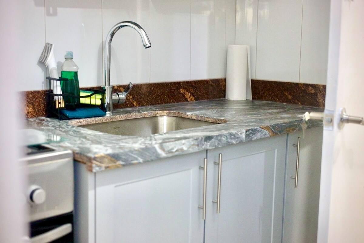 Cómodo estudio de nueva construcción con un dormitorio y un baño con entrada privada, separado de la casa principal. Incluye cocina de nueva construcción con fogones y nevera de tamaño mediano para cocinar durante periodos prolongados. Incluye un cómodo sofá, acceso a internet, televisión por cable, aire acondicionado, agua caliente y lavadora.