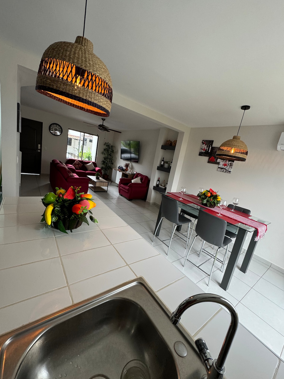 Casa por estrenar, recién amueblada, ideal para familias: 3 habitaciones, 5 camas, A/C en toda la casa, cocina equipada, 2 baños, terraza amueblada, lavadora/secadora y cochera para 2 autos. Ubicada en residencial privado con piscina, amplios jardines, cancha de fútbol y básquet, sendero para caminar y seguridad 24/7. Espacio cómodo, limpio y cercano a supermercados y restaurantes.